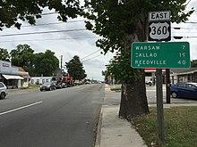 US 360 expands to a four-lane divided highway on arriving in Richmond County. The U.S. Highway heads east as Richmond Road past the historic plantation Mount Airy to the town of Warsaw. In the center of town, through which US 360 is an undivided highway, the highway runs concurrently with SR 3 Business from Main Street to SR 3 (Historyland Highway). US 360 expands to a divided highway at the hamlet of Indian Field and passes through Haynesville before entering Northumberland County at Village. The U.S. Highway veers northeast at Luttrellville and meets the eastern end of SR 202 (Hampton Hall Road) in Callao. At SR 202, US 360 turns east onto Northumberland Highway, which is two lanes within the unincorporated village. The U.S. Highway briefly expands to a four-lane divided highway but is two lanes through Lottsburg. US 360 has another divided highway section before reducing to two lanes through Heathsville, where the highway passes St. Stephen's Episcopal Church and intersects SR 201 (Courthouse Road). The highway passes through Claraville, Horse Head, and Downings Corner before reaching its junction with SR 200 (Jesse DuPont Memorial Highway) at Burgess. US 360 has its final four-lane divided section between Folly and Lilian. At Beverlyville, the U.S. Highway curves south toward Reedville. At SR 657 (Fleeton Road), the U.S. Highway follows Main Street south to its eastern terminus at the intersection of Main Street and Reed Avenue, which are both part of SR 644.[1][2]