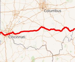 US 50 enters Ohio from Indiana at a traffic light with State Line Road. The route heads northeast as a four-lane undivided highway, passing through farmland and paralleling the tracks of the former Baltimore and Ohio and Big Four Railroad tracks. The highway passes under Interstate 275 before entering the extreme western suburbs of the greater Cincinnati area. The road has an at-grade crossing with former Big Four branch line railroad track, before curving southeast. US 50 has a traffic signal at the intersection with SR 128. Southeast of SR 128, US 50 becomes a four-lane divided highway and cross over the Great Miami River. After the river the route enters Cleves and curves due south and passes through residential properties. In Cleves the highway has a traffic signal with SR 264, before leaving Cleves and entering North Bend. In North Bend the road continues to pass through woodland and residential properties, before passing the monument and tomb of President William Henry Harrison. The highway curves east-southeast and becomes a four-lane undivided highway, before leaving North Bend. The road parallels the Ohio River and passes through a mix of woodland, residential and industrial properties. The route begins to curve northeast and enters Cincinnati.[2][3]