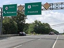 The road enters Old Bridge Township, Middlesex County, where it becomes the Joann H. Smith Memorial Highway and interchanges with the Route 18 freeway. Within this interchange, the travel lanes of US 9 split.[1] From Route 18, the route widens to six lanes as it eventually comes to interchanges with Throckmorton Lane/Ticetown Road and CR 516.[1][2] Past CR 516, the highway passes a mix of woodland and farm fields and crosses Jake Brown Road, where a park-and-ride lot is located on the northeast corner of the intersection.[2] Route 34 intersects US 9 at a directional interchange, with access from southbound US 9 to southbound Route 34 and from northbound Route 34 to northbound US 9. Missing movements between northbound Route 34 and southbound US 9 and northbound US 9 and southbound Route 34 are provided by Perrine Road to the south. From Route 34 through to the US 1/9 concurrency in Avenel, there are no jughandles or other intersections, just right-in/right-out access and interchanges. Past Route 34, the highway continues past the Old Bridge Park & Ride, with a bus terminal next to the northbound lanes serving NJ Transit buses, and several shopping centers, with a southbound exit and entrance serving the park-and-ride and one of the shopping centers. US 9 enters Sayreville, where it passes more suburban areas, interchanging with CR 673 and CR 615.[1][2] A short distance after the latter, the road comes to a partial interchange with the Garden State Parkway at exit 123; this interchange only has access from the Parkway southbound to US 9 south and from US 9 north to the northbound parkway.[1] US 9 narrows to four lanes past this interchange and runs northeast as it enters South Amboy.[1][2] The route comes to an interchange with Route 35, merging onto that route for a concurrency.[1]
