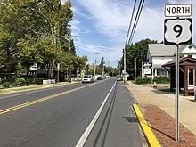 U.S. Route 9 (US 9) is a U.S. highway in the northeast United States, running from Laurel, Delaware north to Champlain, New York. In New Jersey, the route runs 166.80 mi (268.44 km) from the Cape May–Lewes Ferry terminal in North Cape May, Cape May County, where the ferry carries US 9 across the Delaware Bay to Lewes, Delaware, north to the George Washington Bridge in Fort Lee, Bergen County, where the route along with Interstate 95 (I-95) and US 1 continue into New York City. US 9 is the longest U.S. highway in the state. From North Cape May north to Toms River in Ocean County, US 9 is mostly a two-lane undivided road that closely parallels the Garden State Parkway and runs near the Jersey Shore. Along this stretch, it passes through the communities of Rio Grande, Cape May Court House, Somers Point, Pleasantville, Absecon, Tuckerton, Manahawkin, Beachwood and Berkeley Township. In the Toms River area, US 9 runs along the Garden State Parkway for a short distance before heading northwest away from it and the Jersey Shore into Lakewood Township. Upon entering Monmouth County, the route transitions into a multilane suburban divided highway and continues through Howell Township, Freehold Township, Manalapan Township, Marlboro Township, Old Bridge Township, Sayreville, and South Amboy. In Woodbridge Township, US 9 merges with US 1 and the two routes continue through northern New Jersey as US 1/9 to the George Washington Bridge.