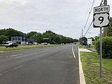A short distance later, in the community of Clermont, Route 83 splits off to the northwest.[1] Past this intersection, US 9 continues northeast through more rural areas, reaching an intersection with CR 625 after passing by Magnolia Lake. Following the CR 625 intersection, the road comes to CR 550, which heads to the west. Not long after the CR 550 intersection, US 9 continues into Upper Township, where it passes rural development before reaching Seaville.[1][2] Here, there is an intersection with the southern terminus of Route 50 and a ramp providing access to the southbound direction of the Garden State Parkway and from the northbound direction of the Garden State Parkway. At this intersection, the route is briefly a divided highway.[1] Past this junction, the road continues northeast, where residential development becomes more constant alongside the road as it passes through Palermo.[2]