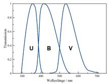 The filters are selected so that the mean wavelengths of response functions (at which magnitudes are measured to mean precision) are 364 nm for U, 442 nm for B, 540 nm for V. Zero points were calibrated in the B−V (B minus V) and U−B (U minus B) color indices selecting such A0 main sequence stars which are not affected by interstellar reddening, to be the benchmark bearing a 0 value.[1] These stars are hot for their modest mass, with a mean effective temperature (Teff (K)) of between 9727 and 9790 Kelvin, the latter being of class A0[a]V (V meaning five)[b].