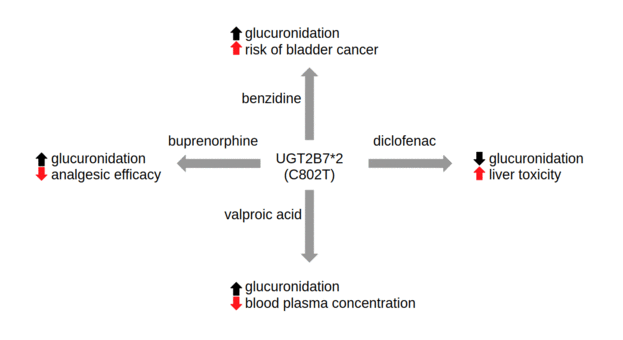 Since UGT2B7 is involved in glucuronidation of many xenobiotic compounds, and polymorphisms of UGT2B7 are prevalent, investigation into potential effects of polymorphisms of UGT2B7 on clearance of pharmacologically relevant compounds is often of interest, as shown by the variety of studies undertaken. The UGT2B7 C802T polymorphism, for example, has been noted at 73% prevalence in Asians and 46% prevalence in Caucasians; therefore, effects of this polymorphism could impact a large portion of the population.[26] However, not all studies find significant changes in clearance due to these genetic polymorphisms. It is not always clear if this is due to the particular polymorphism not affecting enzyme activity of UGT2B7, or because the compound of interest is metabolized by various routes that can mask any differences due to changes in UGT2B7 activity.