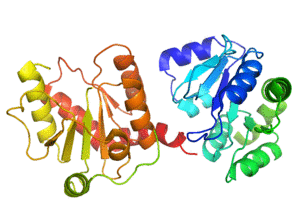 No structure of a full human UGT enzyme has been determined yet, however Miley et al. resolved a partial UGT2B7 structure of the C-terminal portion showing two dimeric domains with Rossman-like folds in complex.[15][16] The Rossman fold typically binds nucleotide substrates, in this case the UDP-glucuronic acid cofactor involved in glucuronidation by UGT2B7. Generally, the C-terminus of UGT enzymes is highly conserved and binds the UDP-glucuronic acid cofactor, while the N-terminus (not resolved in this structure) is responsible for substrate binding.[17] This first resolved structure indicated that the C-terminus of one of the two dimers projected into the UDP-glucuronic acid binding site of the second dimer, thus rendering the second dimer ineffective.