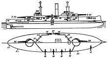 The ship was armed with a main battery of four 13 in (330 mm)/35 caliber guns[a] in two twin-gun turrets on the centerline, one forward and aft. The secondary battery consisted of fourteen 6 in (152 mm)/40 caliber Mark IV guns, which were placed in casemates in the hull. For close-range defense against torpedo boats, she carried sixteen 6-pounder guns mounted in casemates along the side of the hull and six 1-pounder guns. As was standard for capital ships of the period, Alabama carried four 18 in (457 mm) torpedo tubes in deck mounted launchers.[1]