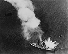 On 25 September 1921, the last round of tests took place. Seven more NBS-1s attacked the ship; three carried 1,100 lb (499 kg) bombs, while the other four carried one 2,000 lb (910 kg) bomb each. One of the 2,000 lb (907 kg) bombs landed close to the ship on the port side; the mining effect caused considerable damage,[b] and Alabama began listing to port. The bombers scored two more near-misses with the 2,000 lb (907 kg) bombs, followed by a direct hit and two near misses with the 1,100 lb (499 kg) bombs. The last bomb, a 2,000 lb (907 kg) weapon, struck the ship at her stern. The blast broke her anchor chains, and the battered ship began to drift toward the wrecks of San Marcos and Indiana, the latter having been sunk in bombing tests earlier that year.[10] The ship remained afloat for another two days before finally sinking in shallow water on 27 September 1921.[2] Mitchell attempted to use the sinking as evidence of the predominance of the bomber in his efforts to secure an independent air force, though the Navy pointed out that the ship was stationary, undefended, unmanned, and was not protected with the latest "all or nothing" armor scheme.[10] The sunken wreck was sold for scrap on 19 March 1924.[2]