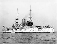 Alabama was laid down at the William Cramp & Sons shipyard in Philadelphia on 2 December 1896 and was launched on 18 May 1898. She was commissioned on 16 October 1900, the first member of her class to enter service.[1] The ship's first commander was Captain Willard H. Brownson. Alabama was assigned to the North Atlantic Squadron, though she remained at Philadelphia until 13 December, when she made a visit to New York, where she remained through January 1901. On the 27th, Alabama steamed south for the Gulf of Mexico, where she joined the rest of the North Atlantic Squadron for training exercises off Pensacola, Florida.[2]