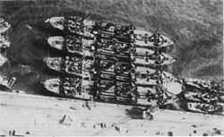The 1st and 6th Marine Divisions landed practically without opposition, and, over the next few days, saw comparatively light resistance. Yet, as they progressed, the Japanese reacted against the invasion fleet. Kamikaze tactics - tested with devastating success in the Philippines campaign - began the first day, inflicting damage to USS West Virginia (BB-48), USS Achernar (AKA-53), USS Tyrrell (AKA-80) and USS Alpine (APA-92). Dive bombers claimed hits on a minesweeper, and other planes bombed attack transport USS Elmore (APA-42). The next day, 2 April, four more attack transports feIt the hot breath of the "Divine Wind".