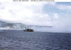 Barrow left Hawaii on 27 January 1945, bound via the Marshalls for the Marianas. She reached Eniwetok on 5 February, fueled from USS Gemsbok (IX-117) and provisioned before resuming the voyage to the Marianas on the 7th. She reached Saipan on 11 February. Bad weather postponed her scheduled practice landings for two days so that only a single rehearsal was carried out off Tinian's western shores on the 13th. The voyage to the Volcano Islands proved uneventful. Barrow - attached to Transport Group "Baker" (Task Group (TG) 53.2) - reached the immediate vicinity of Iwo Jima at dawn on D day, 19 February 1945, and lowered her first boats to the water at 0645. Soon, she sent the medical section of her beach party to the hospital configured tank landing ship, LST(H)-930, before transferring 76 marines to USS Starr (AKA-67) and sending nine of her boats to Lowndes. Barrow then remained in Transport Area "Baker", while the first assault waves landed at 0900. Surprisingly little fire greeted the initial landings, but soon the well dug in Japanese defenders began laying down a withering barrage from a variety of weapons. Before the day was out, 566 Americans were dead and 1,755 wounded.