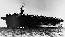 Bougainville was a Casablanca-class escort carrier, the most numerous type of aircraft carriers ever built,[3] and designed specifically to be mass-produced using prefabricated sections, in order to replace heavy early war losses. Standardized with her sister ships, she was 512 ft 3 in (156.13 m) long overall, with a length 490 ft (150 m) at the waterline, she had a beam of 65 ft 2 in (19.86 m), at her widest point, this was 108 ft (33 m), and a draft of 20 ft 9 in (6.32 m). She displaced 8,188 long tons (8,319 t) standard, 10,902 long tons (11,077 t) with a full load. She had a 257 ft (78 m) long hangar deck and a 477 ft (145 m) long flight deck. She was powered with two Uniflow reciprocating steam engines, which drove two shafts, providing 9,000 shp (6,700 kW), thus enabling her to make 19 knots (35 km/h; 22 mph). The ship had a cruising range of 10,240 nmi (18,960 km; 11,780 mi) at a speed of 15 kn (28 km/h; 17 mph). Her compact size necessitated the installation of an aircraft catapult at her bow, and there were two aircraft elevators to facilitate movement of aircraft between the flight and hangar deck: one each fore and aft.[4][3][5]