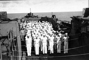 Following her service in Operation Overlord, LST-504 was directed towards Sicily to prepare for the invasion of Southern France. En Route, the convoy that LST-504 now led spotted a German ship. Orders were given for the convoy to turn, however one ship misinterpreted the order and turned the wrong way. A collision with that ship damaged the bow door of LST-504. The 504 was diverted to Bizerte, Tunisia for repairs.[3] Once the repairs were completed, the 504 embarked for her original destination of Italy. For the months of August and September, 1944, LST-504 carried troops between Italy and Southern France. She was then assigned to the Asiatic-Pacific Theater and took part in the assault and occupation of Okinawa Gunto in April and June, 1945. Following the War, LST-504 performed occupation duty in the Far East until mid-January, 1946.She was decommissioned on 15 January 1946 in Tokyo Bay. The decommissioning ceremony took place on the main deck of the 504 at 5 minutes after 4 o'clock (1605 hours). At that time 19 officers and 30 enlisted men of the Japanese navy came aboard and the 504 was given to the Japanese. .