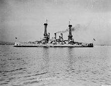 Following her return from the world cruise, Connecticut continued to serve as flagship of the Atlantic Fleet, interrupted only by a March 1909 overhaul at the New York Navy Yard.[56] After rejoining the fleet, she cruised the East Coast from her base at Norfolk, Virginia. For the rest of 1909, the battleship conducted training and participated in ceremonial observances, such as the Hudson–Fulton Celebration.[6][57] In early January 1910, Connecticut left for Cuban waters and stayed there until late March when she returned to New York for a refit.[58] After several months conducting maneuvers and battle practice off the New England coast, she left for Europe on 2 November to go on a midshipman training cruise.[58] She arrived in Portland, England on 15 November and was present during the 1 December birthday celebration of Queen Alexandra, the queen mother. Connecticut next visited Cherbourg, France, where she welcomed visitors from the town and also hosted commander-in-chief of the French Navy Vice-Amiral Laurent Marin-Darbel, and a delegation of his officers. While there, a boat crew from Connecticut engaged a crew from the French battleship Charles Martel in a rowing race; Connecticut's crew won by twelve lengths. Connecticut departed French waters for Guantánamo Bay, Cuba, on 30 December,[59] and stayed there until 17 March, when she departed for Hampton Roads.[60]