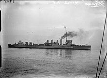 Craven was 315 feet 6 inches (96.16 m) long overall and 310 feet (94.49 m) at the waterline, with a beam of 30 feet 7 inches (9.32 m)[3] and a draft of 8 feet 10 inches (2.69 m). Displacement was 1,120 long tons (1,140 t) normal and 1,187 long tons (1,206 t) full load.[4] Four Thornycroft boilers fed Parsons geared steam turbines rated at 20,000 shaft horsepower (15,000 kW) and drove two propeller shafts, giving a design speed of 30 knots (56 km/h; 35 mph). Four funnels were fitted.[5][6] Craven reached a speed of 32.33 knots (59.88 km/h; 37.20 mph) during sea trials.[7]