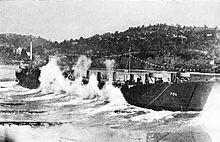 USS Garrett County (LST-786) passing under the San Francisco–Oakland Bay Bridge in San Francisco Bay, 20 August 1966, probably during acceptance trials prior to recommissioning. Garrett County was activated by the Supervisor of Shipbuilding San Francisco, and moved to Mare Island for commissioning. | |