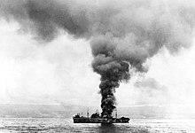 Though the lightly armored 'Betty' disintegrated on impact with the hull of George F. Elliott, wreckage and burning gasoline showered the deck and its engines were able to punch through the unarmored hull into the rear cargo hold, severing the ships rear fire main in the process. A massive fire broke out onboard both topside and deep within the hull, where supplies destined for shore now fed the flames which the crew raced to contain. Fires below deck quickly grew out of control and forced the engine room crew to abandon their stations, bringing George F. Elliott to a stop in the middle of Ironbottom Sound. Using a bucket brigade and whatever means they could to fight the fires, the crew made a valiant stand against the advancing flames as the continuing Japanese attack kept nearby ships from providing any assistance to the burning transport. By the time the remnants of the Japanese bomber force had departed the area it was too late for George F. Elliott, as the intense flames caused a damaged bulkhead to fail, releasing bunker fuel into the rear hold and turning a massive fire into an inferno. Shortly after 13:00, the crew was ordered to abandon ship.