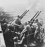 The main armament of the Essex-class ships consisted of a dozen 38-caliber 5-inch (127 mm) dual-purpose guns arranged in two superfiring pairs of twin-gun turrets fore and aft of the island and four guns in single mounts on the port side of the flight deck. These guns were controlled by a pair of Mk 37 directors, mounted on the top of the island; each director was fitted with a Mk 4 fire-control radar. The early short-hull Essexs were equipped with eight quadruple 40-millimeter (1.6 in) Bofors anti-aircraft (AA) guns; one mount each at the bow and stern, four atop the island and two on the port side of the flight deck, next to the 5-inch guns. Each mount was controlled by its own Mk 51 director. The carriers were also fitted with 46 Oerlikon 20-millimeter (0.8 in) light AA guns on single mounts along the sides of the flight deck and on the island.[10]