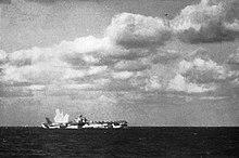 The task group was too far away to intervene when the Japanese surprised the American escort carriers off the coast of Samar on the morning of 25 October with their force of battleships and cruisers, but McCain's carriers were able to close the distance enough by the early afternoon to launch two long-range airstrikes that accomplished little. The Americans lost 14 aircraft to all causes and failed to significantly damage any of Vice Admiral Takeo Kurita's ships. The following morning, after TG 38.1 and 38.2 rendezvoused, they launched an 257-aircraft airstrike that attacked Kurita's ships.[50] Avengers from Hornet and Cowpens hit the light cruiser Noshiro with one bomb that started a quickly extinguished fire. About twenty minutes later another Avenger put a torpedo into the cruiser; the detonation disabled all of her boilers and left her dead in the water. About an hour and a half after that, 28 of Hornet's Avengers and Helldivers hit Noshiro again with a torpedo and she sank an hour later.[51]