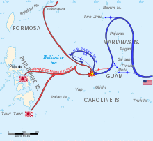 That night the Americans had tracked reinforcements flying from Truk to Guam and Mitscher ordered fighters from Task Group 58.1 to patrol over Orote Field. Hellcats from Belleau Wood were the first to engage Japanese aircraft taking off at 07:00 and they had to be reinforced by fighters from Hornet and Yorktown. By 09:30 they had claimed to have shot down 45 fighters and 5 other aircraft while only losing a pair of Hellcats. At that time Hornet launched an air strike of 17 Helldivers and 7 Avengers, escorted by a dozen Hellcats, that bombed Orote without encountering Japanese aircraft. At 09:50 an incoming Japanese air strike had been picked up on radar and the carriers turned into the wind to begin launching 140 fighters; at 10:04, the fighters patrolling over Guam were summoned to reinforce the Combat Air Patrol (CAP) over Task Force 58, although they were too late to participate in the aerial battle. The CAP, reinforced by the newly launched Hellcats, intercepted the Japanese, shooting down 40 of the 57 Zeros involved and seriously disrupting the Japanese attack which only inflicted minor damage on one battleship.[30] Hornet contributed Hellcats who claimed to have shot down 9 Zeros and 3 Nakajima B6N "Jill" torpedo bombers.[31] The second wave of aircraft was detected at 11:07, but Hornet's fighters did not participate in their defeat. The third wave was given erroneous locations for the American ships and were 120 nmi (220 km; 140 mi) northwest of them at 12:40. Most of them turned back, but about a dozen did not and were detected by Task Group 58.1 at 12:56. They were intercepted by 17 Hellcats from Hornet and Yorktown which shot down 6 Zeros and a Jill, with Hornet's fighters claiming 9 aircraft in exchange for a damaged Hellcat.[32] The fourth wave was also misdirected and most of the aircraft decided to continue onwards and land on Guam. They arrived there around 15:00 and were intercepted by 41 Hellcats from Hornet, her sister Essex, Cowpens and Enterprise. They shot down 40 of the 49 aircraft; two of Hornet's pilots shot down five Japanese aircraft as they were attempting to land.[33]