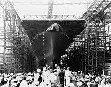 The Chief of Naval Operations had ordered three Essex-class carriers on 10 May 1940 in anticipation of Congress passing the Two-Ocean Navy Act,[16] although the ship that later became Hornet originally had the name Kearsarge with the hull number of CV-12. The contract to build her was awarded to Newport News Shipbuilding on 9 September 1940, and her keel was laid down on 3 August 1942. The seventh Hornet (CV-8) was sunk in the Battle of Santa Cruz on 26 October 1942, and the CV-12 hull was renamed Hornet shortly afterwards.[17] The ship was launched on 30 August 1943 with her sponsor being Annie Reid Knox, wife of Secretary of the Navy Frank Knox. She was commissioned on 29 November 1943 with Captain Miles R. Browning in command.[18]