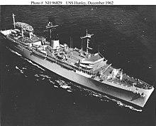 USS Hunley (AS-31) was a submarine tender of the United States Navy launched on 28 September 1961 and commissioned 16 June 1962. The Hunley was designed to tend most of the long-term requirements of the Polaris Class of submarines. The ship achieved several records and milestones in its service. The Hunley was decommissioned from the regular navy, in 1995 transferred to the US Maritime Commission, and in 2007 sold as scrap to a metal recycling company in Louisiana. In September 2008, during Hurricane Gustav, the decommissioned ship broke free of its moorings in the New Orleans Inner Harbor, but caused little or no damage while adrift.[1]