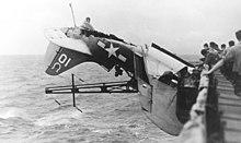 After Kurita's force began to withdraw, Halsey ordered TF 38 to steam north to intercept the aircraft carriers of the Northern Force, commanded by Vice Admiral Jisaburō Ozawa.[1] Bogan correctly perceived that Ozawa's force was intended to lure TF 38 away from the landing area to allow Kurita to attack it, but Halsey overruled him and several other Task Group commanders who voiced similar concerns.[7] Early on 25 October, aircraft from Intrepid and the other carriers launched a strike on the Japanese carriers. Aircraft from Intrepid scored hits on the carrier Zuihō and possibly the carrier Zuikaku. Further strikes throughout the morning resulted in the sinking of four Japanese aircraft carriers and a destroyer in the Battle off Cape Engaño.[1][8] Halsey's preoccupation with the Northern Force allowed Kurita the respite he needed to turn his force back to the east, push through the San Bernardino Strait, where it engaged the light forces of escort carriers, destroyers, and destroyer escorts that were directly covering the landing force in the Battle off Samar. Kurita nevertheless failed to break through the American formation, and ultimately broke off the attack.[1]