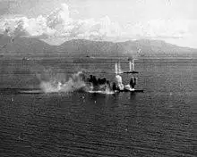 Between 23 and 26 October, the Japanese Navy launched a major operation to disrupt the Allied landings in the Philippines, resulting in the Battle of Leyte Gulf. On the morning of 24 October, a reconnaissance aircraft from Intrepid spotted Vice Admiral Takeo Kurita's flagship, Yamato. Two hours later, Intrepid and Cabot launched a strike on Kurita's Center Force, initiating the Battle of the Sibuyan Sea; this included eight Curtiss SB2C Helldiver dive bombers from Intrepid, which launched their attack at 10:27. One 500-pound (230 kg) bomb struck the roof of Turret No. 1, failing to penetrate. Two minutes later, the battleship Musashi was struck starboard amidships by a torpedo from a Grumman TBF Avenger, also from Intrepid. In return, the Japanese shot down a pair of Avengers. Another eight Helldivers from Intrepid attacked Musashi again at around noon, scoring two more hits, with two Helldivers shot down. Three minutes later, nine Avengers attacked from both sides of the ship, scoring three torpedo hits on the port side. Further strikes from Essex and Lexington inflicted several more bomb and torpedo hits at around 13:30. At 15:25, Musashi was attacked by 37 aircraft from Intrepid, the fleet carrier Franklin and Cabot. These aircraft scored hits with 13 bombs and 11 torpedoes during this attack, for the loss of three Avengers and three Helldivers.[5] In addition to the loss of Musashi, many of Kurita's other ships, including Yamato, the battleships Nagato and Haruna, and heavy cruiser Myōkō were damaged in the attacks, forcing him to break off the operation temporarily.[1][6]