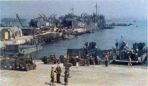 LST-374, starboard of LST-376, loads a DUKW amphibious truck at an unidentified English port prior to the Invasion of Normandy | |