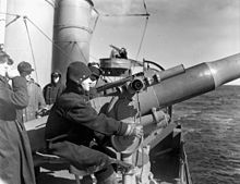 Their improved armament reflected designs by British and German navies.[3] The Clemson class was initially armed with four 4"/50 caliber guns; one situated on the forecastle, two on the superstructure deck amidships and one on the quarterdeck. The quarterdeck gun was later moved to the aft deck superstructure to make room for depth charge roller tracks. The 4"/50 guns had limited elevation and could not fire at aircraft. A 3"/23 caliber gun was installed for anti-aircraft warfare defense, along with two .50 caliber machine guns.[1] The mainmast was shortened to improve the field of fire for the 3-inch gun.[3] Mk 6 and Mk 9 depth charges were equipped in US service and were deployed via the aforementioned roller tracks or "K" or "Y" guns. The destroyers also mounted twelve torpedo tubes in four triple mounts capable of firing 21-inch (533 mm) torpedoes. The tube mounts were sited amidships between the superstructures. The destroyers carried no spare torpedoes.[1]