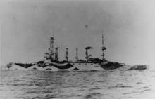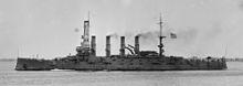 The keel for Montana was laid down at the Newport News Drydock & Shipbuilding Co. in Newport News on 29 April 1905. Her completed hull was launched on 15 December 1906, and after fitting-out work was completed, the new cruiser was commissioned into the United States Navy on 21 July 1908. She was assigned to the Atlantic Fleet and was transferred to Norfolk, Virginia. Montana steamed out of Norfolk on 5 August for a cruise off the eastern coast of the United States that lasted until 25 January 1909.[4] On 8 October 1908 she put on a searchlight display as part of a fireworks display at Philadelphia. During the display her searchlights blinded the operator of Philadelphia Police Department steamer Visitor that then had a slight collision with a barge that "Visitor" was going to, to help put out a fire on board caused by malfunctioning fireworks.[5] After a stop in Charleston, South Carolina, she continued south through the Caribbean Sea, arriving at Colón, Panama on 29 January. There, she joined the Special Service Squadron. This duty was interrupted twice;[4] the first came in February, when she returned to Hampton Roads, Virginia, where she and the rest of the Atlantic Fleet greeted the Great White Fleet at the conclusion of its circumnavigation of the globe.[6] The second came in April, owing to instability in the Ottoman Empire following the Young Turk Revolution that threatened American interests. Montana departed Guantanamo Bay, Cuba, on 2 April, when she was sent to the Mediterranean to protect Americans in the region. She remained there until 23 July, when she left Gibraltar, arriving in Boston on 3 August. She thereafter returned to her normal operations patrolling the eastern coast of the United States.[4]