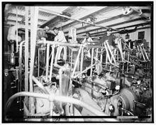 The engineering plant included four coal-fired locomotive boilers producing 160 psi (1,100 kPa) steam, with two horizontal triple expansion engines totaling 8,500 ihp (6,300 kW) driving two shafts for a speed of 18 knots (33 km/h; 21 mph).[1][2][4] Like other US Navy ships of the 1880s, she was built with a sail rig to increase cruising range, later removed. The ship carried up to 400 tons of coal, with a cruising range as built of 3,922 nmi (7,264 km; 4,513 mi) at 10 kn (19 km/h; 12 mph); this could be increased to 850 tons for a range of 8,333 nmi (15,433 km; 9,589 mi).[4]