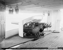 Newark was armed with 12 6-inch (152 mm)/30 caliber Mark 3 guns[5] in sponsons along the sides. This allowed ahead and astern fire by up to four guns.[6] Secondary armament was four 6-pounder (57 mm (2.2 in)) guns, four 3-pounder (47 mm (1.85 in)) Hotchkiss revolving cannon, two 1-pounder (37 mm (1.5 in)) Hotchkiss revolving cannon, and four .45 caliber (11.4 mm) Gatling guns.[1][4] Six 14-inch (356 mm) torpedo tubes were included in the design but never mounted.[2]