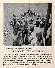 On the morning of 1 May, Commodore Dewey—with his flag aboard Olympia—steamed his ships into Manila Bay to confront the Spanish flotilla commanded by Rear Admiral Patricio Montojo y Pasarón.[34] The Spanish ships were anchored close to shore, under the protection of coastal artillery, but both the ships and shore batteries were outdated.[35] At approximately 5:40 a.m., Dewey instructed Olympia's captain, "You may fire when you are ready, Gridley".[36] Gridley ordered the forward 8-inch gun turret, commanded by Lt. Stokely Morgan, to open fire, and the starboard 8-inch gun fired the first shell of the battle at the Spanish flagship Reina Christina, prompting the other American warships to begin firing.[37][36][38]