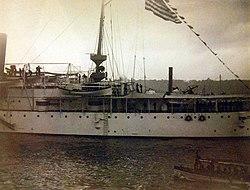 After the end of the war, Olympia sailed to the Mediterranean via Portsmouth, England.[33] In December 1918, the ship became the flagship for American naval forces stationed in the eastern Mediterranean Sea. While on this assignment, she continued in her old role of showing the flag and conducting goodwill visits in various Mediterranean ports.[40] This included a period of policing duty in the Adriatic Sea from 21 January to 25 October 1919; the Dalmatian coast was in a state of turmoil following the collapse of the Austro-Hungarian Empire at the end of the war. On 1 April 1919, she was in Spalato, now Split, with Israel and Lansdale.[43] On 18 August, she steamed to the Black Sea to aid the return of refugees from the Balkans who had fled during the war. She was back in the Adriatic Sea by 19 September, and four days later had to deploy a landing party to prevent an incident between Italian and Yugoslavian forces.[33]