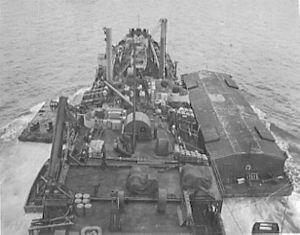 Tantalus underway. Note the pontoon causeway secured to her starboard side. | |