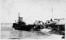 At about this time, the giant wave Memphis had seen approaching over the past hour arrived; she rolled into a deep trough and was struck immediately by what proved to be three very large waves in rapid succession, the highest of them estimated by the crew to have been 70 ft (21 m) in height, completely swamping her except for her highest points, and washing crewmen overboard. The waves rolled her heavily, caused her to strike the harbor bottom, then pushed her to the beach .5 nmi (0.58 mi; 0.93 km) away. By 17:00, she had been driven under cliffs along the coast of the harbor and was resting on the harbor bottom. She was battered into a complete wreck in 90 minutes. Castine, meanwhile, managed to reach safer waters by getting underway and putting to sea through the large waves, although damaged by them and at times in danger of capsizing.[4]