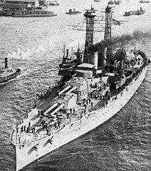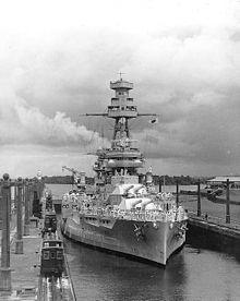 She returned to New York early in 1929 for her annual overhaul and had completed it by March when she began another brief tour of duty in the Pacific. She returned to the Atlantic in June and resumed normal duty with the Scouting Fleet. In April 1930, she took time from her operating schedule to escort Leviathan into New York when that ship carried the returning US delegation to the London Naval Conference. In January 1931, she left the yard at New York as flagship of the United States Fleet and headed via the Panama Canal to San Diego, California, and then on to Los Angeles (port of San Pedro) which became her home port for the next six years and three months.[39][40] There would be a temporary redeployment back to the Atlantic from April to October 1934.[41] During this Pacific period, she served first as flagship for the entire Fleet and, later, as flagship for BatDiv 1.[10]