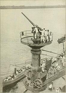 Upon her return to active duty with the fleet, Texas resumed a schedule alternating between training operations along the New England coast and off the Virginia Capes and winter fleet tactical and gunnery drills in the West Indies. That routine lasted just over two years until the February-to-March crisis over unrestricted submarine warfare catapulted the US into World War I in April 1917. The 6 April declaration of war found Texas riding at anchor in the mouth of the York River with the other Atlantic Fleet battleships. She remained in the Virginia Capes–Hampton Roads vicinity until mid-August, conducting exercises and training Naval Armed Guard gun crews for service onboard merchant ships.[10] One of the gun crews trained aboard Texas was assigned to the merchant vessel Mongolia at the beginning of the war. On 19 April, the crew of Mongolia sighted a surfaced German U-boat and the gun crew trained aboard Texas opened fire on the U-boat, averting an attack on Mongolia and firing the first American shots of World War I.[27]