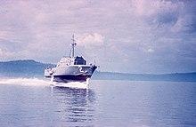 The Tucumcari (PGH-2) was a Boeing-built hydrofoil. Named after Tucumcari, New Mexico, it was the basis for the technology used in the subsequent Pegasus-class patrol boats and the Jetfoil ferries. Its unique feature was a waterjet propulsion and a computer-controlled fully submerged foil configuration of one foil at the bow and foils on the port and starboard sides. The Tucumcari was one of two prototype boats contracted by the Navy for the purpose of evaluating the latest hydrofoil technology. The second boat was the rival Grumman built USS Flagstaff (PGH-1).