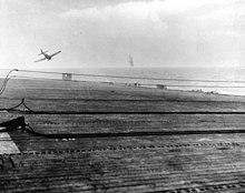 The Japanese surface force broke off its pursuit from 0912–0917 hours, and after milling around in apparent confusion for a time, retired northward to San Bernardino Strait. The retreat by Kurita's surface force, however, did not end the ordeal for White Plains and her fellow warships. After a 90-minute respite, they suffered harassment from a different quarter. At 1050 hours, a formation of nine Japanese Navy Zeke fighters appeared and began simultaneous kamikaze attacks. Two of them singled out White Plains as their victim. Her antiaircraft gunners responded, hitting one of the intruders, which immediately changed course and crashed into USS St. Lo, which eventually sank. The other aircraft continued on toward White Plains, but her antiaircraft guns finally brought him down yards astern, scattering debris all over the ship's deck and sides, but causing only 11 relatively minor casualties.[4] In the meantime, USS Kitkun Bay and USS Kalinin Bay also suffered from kamikaze crashes, but neither of these proved to be fatal to the carriers. That attack proved to be the final combat action of USS White Plains. She steamed to the naval base at Manus with the other surviving carriers, arriving on 31 October. After an inspection of the damage, it was decided that the battered escort carrier should return to the United States for complete repairs. Accordingly, she departed from Manus on 6 November and headed to the West Coast, arriving at San Diego Harbor on 27 November; repairs began immediately.