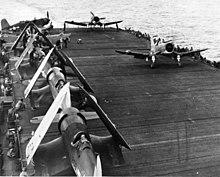 Upon taking on board the cargo required to sustain her replenishment duties, Windham Bay took to sea, as a part of Task Unit 50.8.4, the CVE Plane Transport Unit, along with her sister ships Admiralty Islands, Bougainville, and Attu. As a part of Task Group 50.8, the Logistics Support Group, the replenishment carriers were under the command of Rear Admiral Donald B. Beary. En route, the carriers were screened by the destroyer escorts Greiner, Sanders, and Wyman.[8] She arrived off Iwo Jima on 19 February, whereupon she began delivering replacement aircraft and crews to the fleet carriers conducting operations over the island, with the transferring aircraft being screened by the fighter contingents of Makassar Strait and Shamrock Bay. Task Unit 50.8.4 first conducted deliveries to Task Groups 58.1, 58.4, and 58.5 on 19 February, conducted deliveries to Task Groups 58.2 and 58.3 the following day, and then deliveries to all the Task Groups excepting 58.5 on 21 February. Her main duties finished, Windham Bay continued delivering a trickle of planes until 1 March, when her Task Group returned to replenish at Ulithi. In total, the four escort carriers had delivered 254 aircraft and 65 plane crews to the fleet carriers, the majority of which were transferred on the first three days.[9][7]