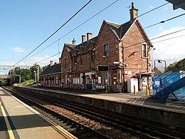 The building on Station Road, housing various public facilities,[8] leads to Platform 1 (Glasgow-bound trains). A footbridge over the double track connects to Platform 2 (Motherwell/Edinburgh-bound trains) and the car park.