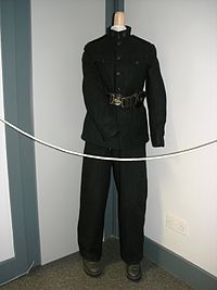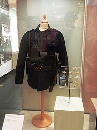 Uniforms were not available at the outset so the men of the B Specials went on duty in their civilian clothes wearing an armband to signify they were Specials. Uniforms did not become available until 1922. Uniforms took the same pattern as RIC/RUC dress with high collared tunics. Badges of rank were displayed on the right forearm of the jacket.[41]
