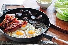 The "traditional" full English breakfast,[8] treated as a dish rather than a meal, includes bacon (traditionally back bacon),[9] fried, poached or scrambled eggs, fried or grilled tomatoes, fried mushrooms, fried bread or buttered toast, and sausages (also known as "bangers").[10] Black pudding, baked beans, and bubble and squeak are also often included.[11][12] In the North Midlands, fried or grilled oatcakes sometimes replace fried bread. The food is traditionally served with tea or coffee,[13] as well as fruit juices.