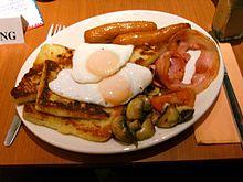A full breakfast is a substantial cooked breakfast meal, often served in the United Kingdom and Ireland, that typically includes bacon, sausages, eggs, black pudding, baked beans, tomatoes and mushrooms, toast, and a beverage such as coffee or tea. It appears in different regional variants and is referred to by different names depending on the area. While it is colloquially known as a "fry up" in most areas of Britain and Ireland, it is usually referred to as a full English breakfast in England (often shortened to "full English"),[1] and as a "full Irish", "full Scottish", "full Welsh", "full Cornish", and "Ulster fry" in the Republic of Ireland, Scotland, Wales, Cornwall, and Northern Ireland, respectively.[2][3][4]