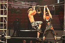 TNA official Don Callis received on-screen credit for the idea for the Ultimate X match. The tagline "No Limits and No Ladders" was added to the first match to emphasize the change. In this first match, bare steel wires, which were not secured in the center, were used above the ring, allowing them to bounce separately and causing the belt to tear off twice, requiring it to be reattached. In all future matches, standard ring cables were used, and the ropes were secured at their crossing.[1] Matches are typically referred to by number ("Ultimate X1", "Ultimate X2", etc.). TNA has not noted the numeratical order by name, however. This has only been practiced by fans since X4. The Ultimate X match type is a match type in the TNA Impact! game, released in September 2008.