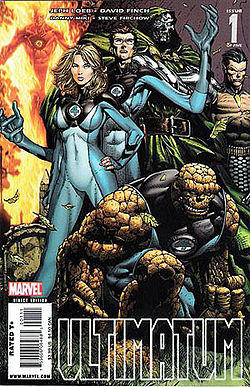 "Ultimatum" is a 2009 comic book storyline published by Marvel Comics under its Ultimate Marvel imprint. It consists of a core five-issue eponymous miniseries written by Jeph Loeb and illustrated by David Finch that was published from January 2009 to September 2009, and a number of tie-in books. The storyline deals with Magneto's attempts to destroy the world following the apparent deaths of his children, Scarlet Witch and Quicksilver in The Ultimates 3.