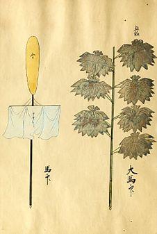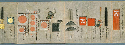 Uma-jirushi (馬印, horse insignia) were massive flags used in feudal Japan to identify a daimyō or equally important military commander on the field of battle. They came into prominence during the Sengoku period. While many were simply large flags, not very different from sashimono or hata-jirushi, most were three-dimensional figures, more like kites, and in the shape of bells, gongs, umbrellas, or streamers.