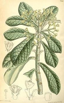 An additional report appeared in an 1882 note in the journal Nature written by Reverend G. W. Parker, a missionary in Madagascar.[19] He describes two types: a small, shrub-like form, and a larger tree with two layers of bark—a dead outer layer, and a new living layer that grows beneath it; both are described as having red and black fruit and brittle, glossy, lanceolate leaves. Parker notes the umdhlebe is reported to grow in a variety of habitats, but to prefer rocky ground and that due to superstition, the area around the tree is never inhabited despite often being fertile'.[19]
