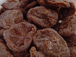 Umeboshi (Japanese: 梅干, pronounced [ɯmeboɕi], literally 'dried ume') are pickled (brined) ume fruits common in Japan. The word umeboshi is often translated into English as 'salted Japanese plums', 'Japanese plums' or 'preserved plums'. Ume (Prunus mume) is a species of fruit-bearing tree in the genus Prunus, which is often called a "plum", but is actually more closely related to the apricot.[1] Pickled ume which are not dried are called umezuke (梅漬け).