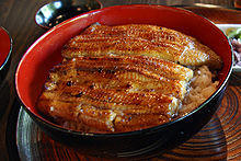 Unadon (鰻丼, an abbreviation for unagi donburi, "eel bowl") is a dish originating in Japan. It consists of a donburi type large bowl filled with steamed white rice, and topped with fillets of eel (unagi) grilled in a style known as kabayaki, similar to teriyaki. The fillets are glazed with a sweetened soy-based sauce, called tare and caramelized, preferably over charcoal fire. The fillets are not flayed, and the grayish skin side is placed faced down.[1] Sufficient tare sauce is poured over so that some of it seeps through the rice underneath.[1] By convention, pulverized dried berries of sanshō (called Japanese pepper, although botanically unrelated) are sprinkled on top as seasoning.